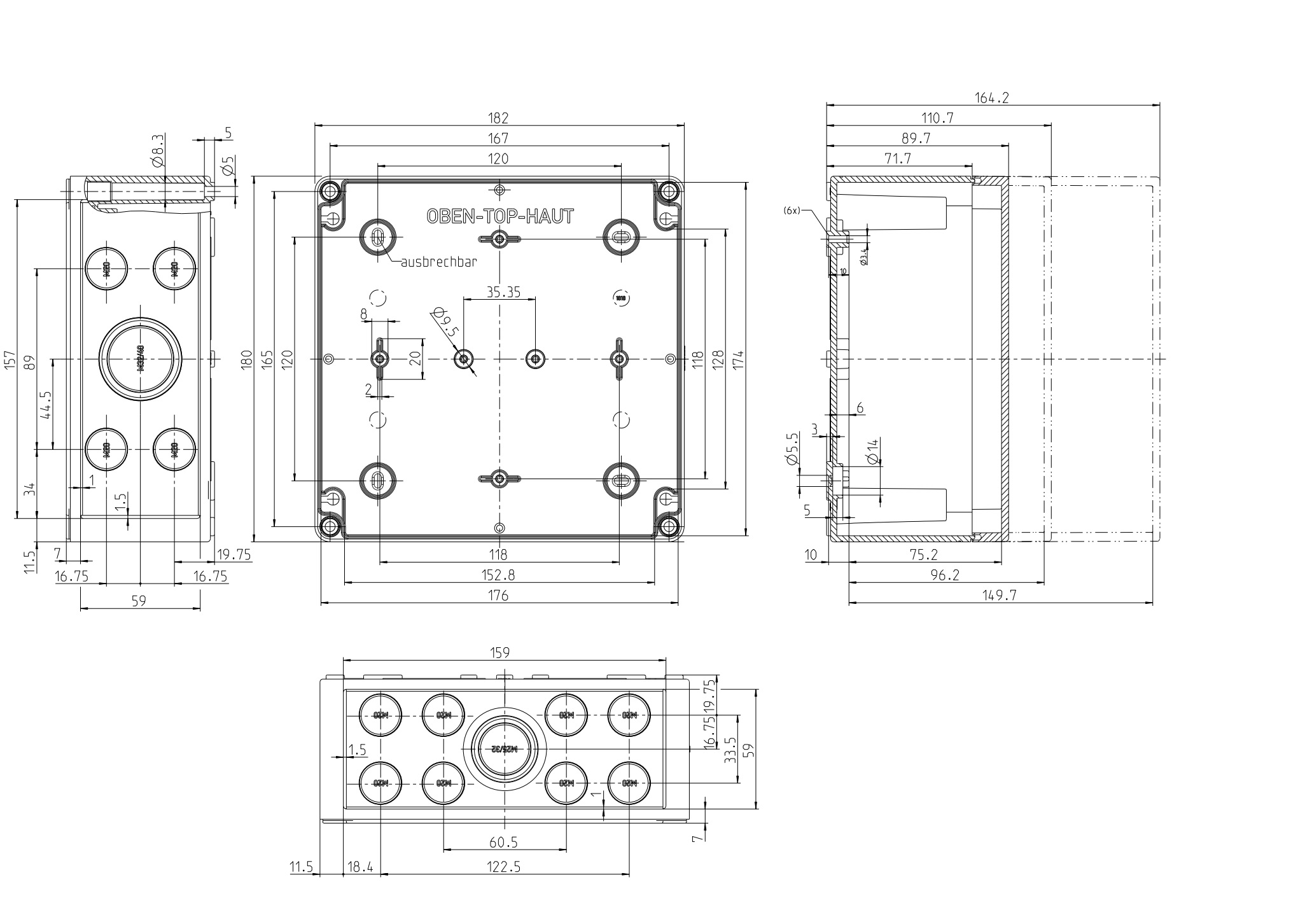 IP66 Polystyrene Junction box with cable gland knockouts.- 4 x M32/40 24 x M20 , colour grey RAL 6018, top cover is opaque grey
