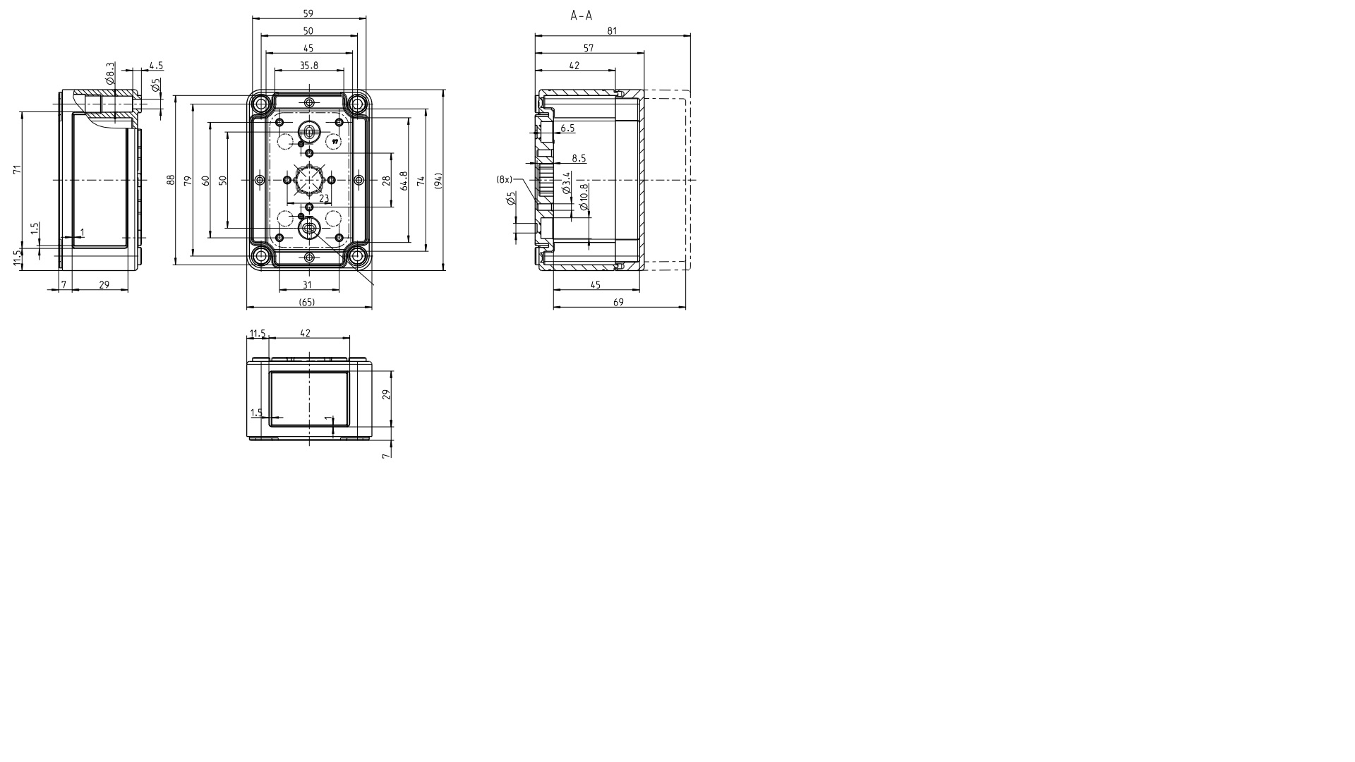 IP66 Polycarbonate Junction box without cable gland knockouts. colour grey RAL 6018, top cover is opaque grey