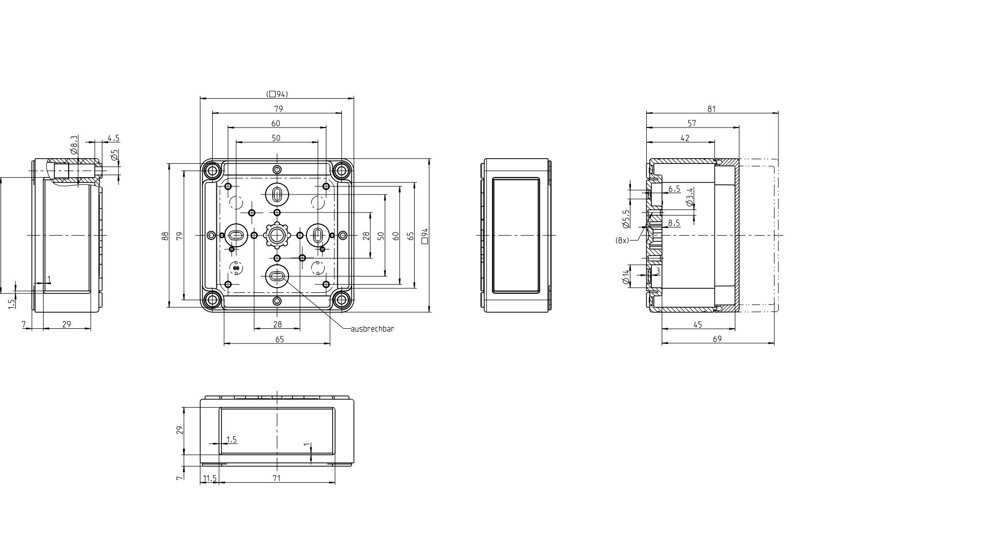 IP66 Polycarbonate Junction box without cable gland knockouts. colour grey RAL 6018, top cover is opaque grey