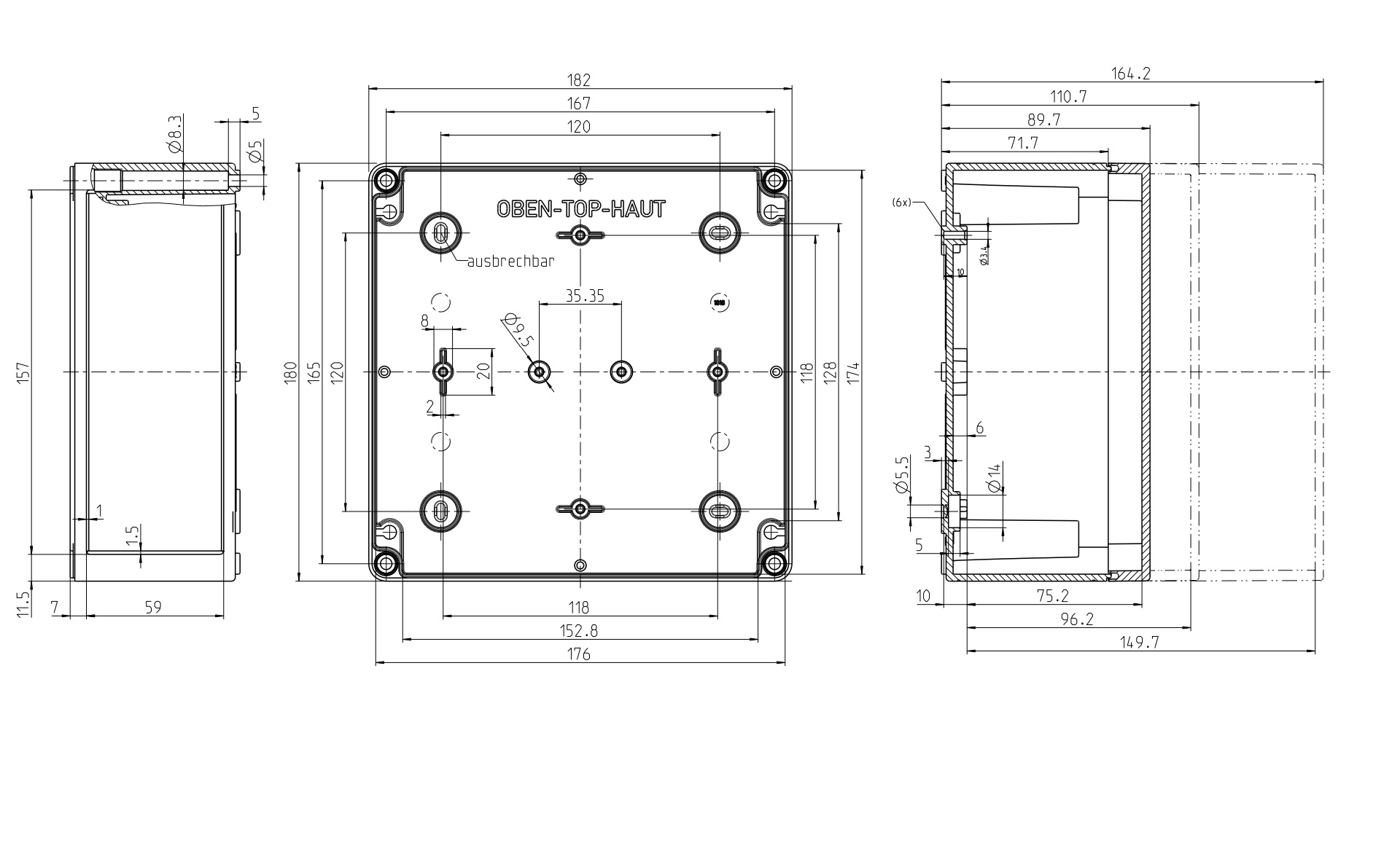 IP66 Polycarbonate Junction box without cable gland knockouts. colour grey RAL 6018, top cover is opaque grey
