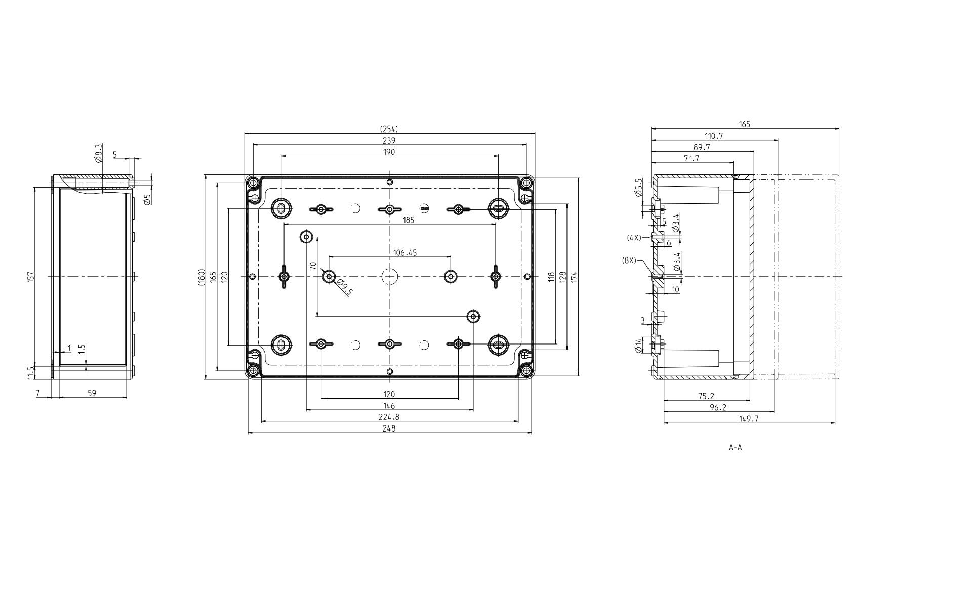 IP66 Polycarbonate Junction box without cable gland knockouts. colour grey RAL 6018, top cover is opaque grey