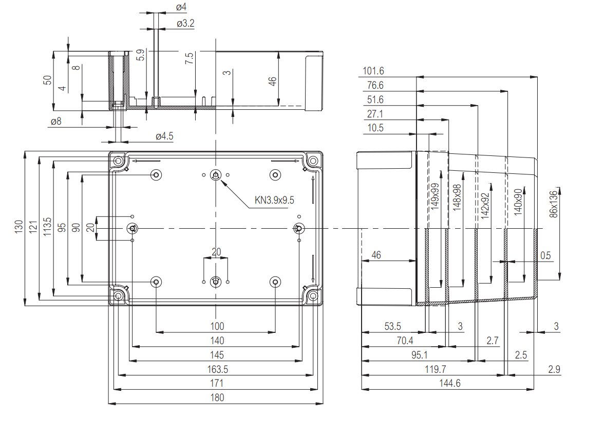 Rectangular, grey, RAL 7035, base 25mm, screw together, IP 67 rated, internal PCB stand off’s, smooth finish, material ABS, clear top, transparent cover.