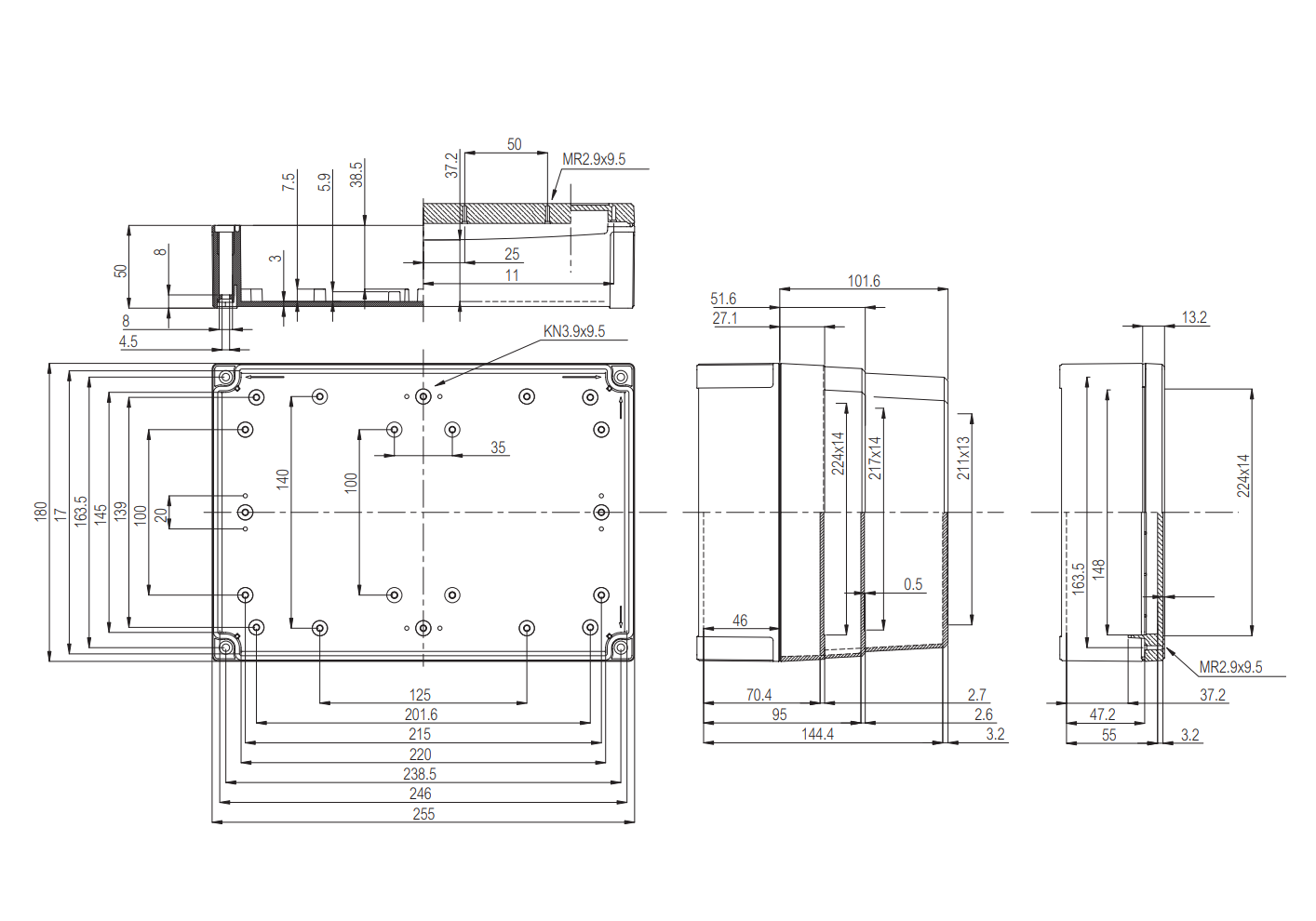 Rectangular, grey, RAL 7035, base 25mm, screw together, IP 67 rated, internal PCB stand off’s, smooth finish, material ABS.