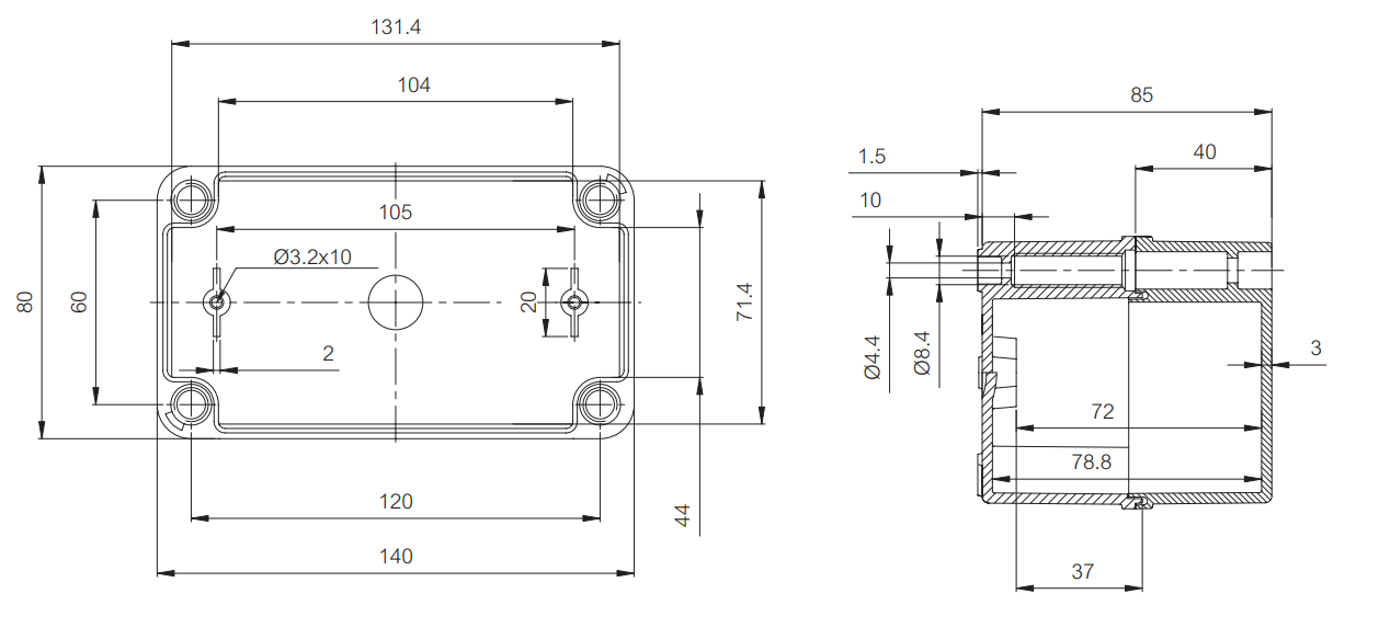 Internally there are mounting points in the base of the enclosure which are suited for PCB, Din rail and mounting plates.