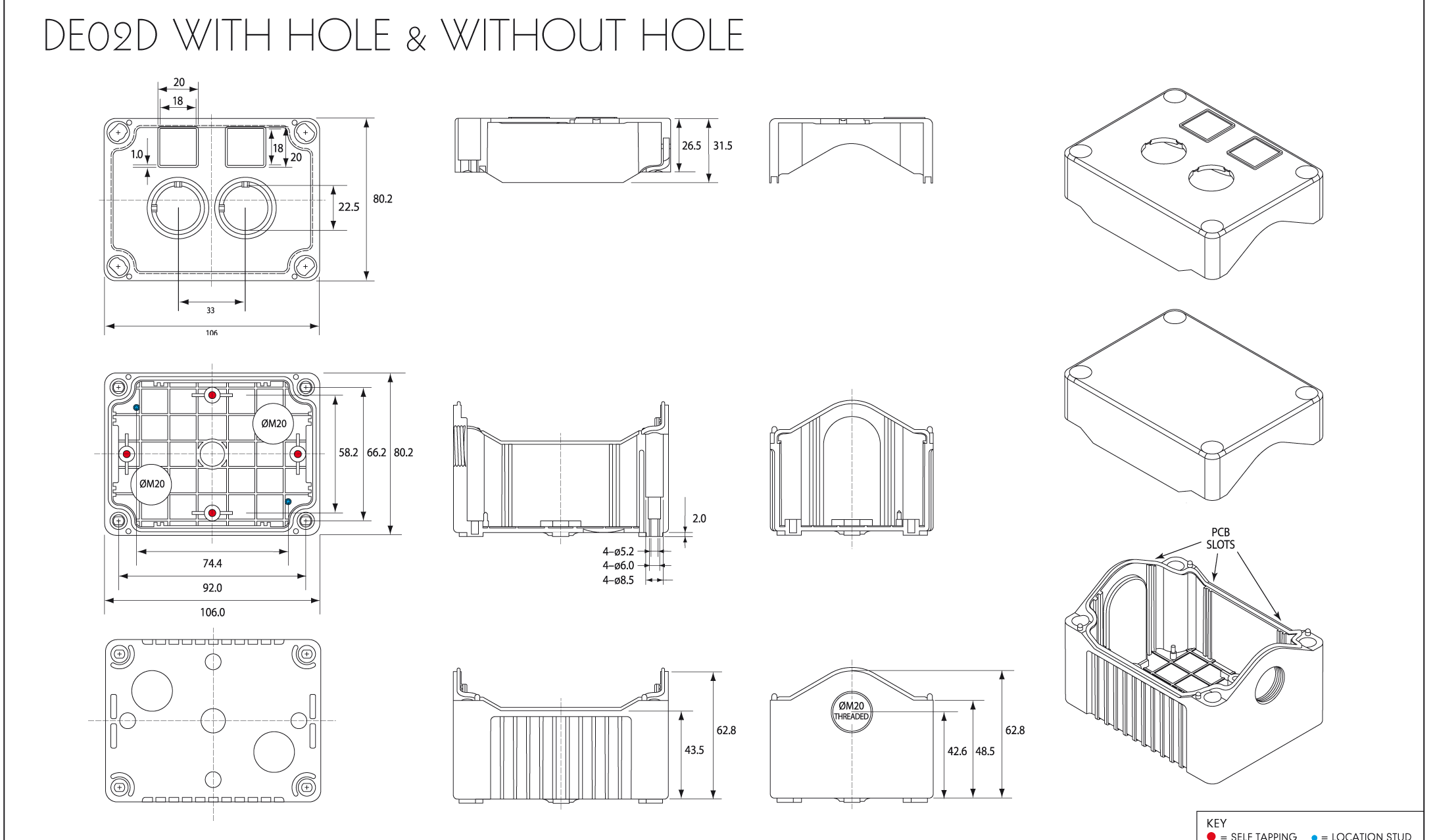 The DE0 series of junction boxes are moulded in both ABS and polycarbonate material. Both materials are available in black and grey with a clear lid option. There are a total of eight sizes in this range.