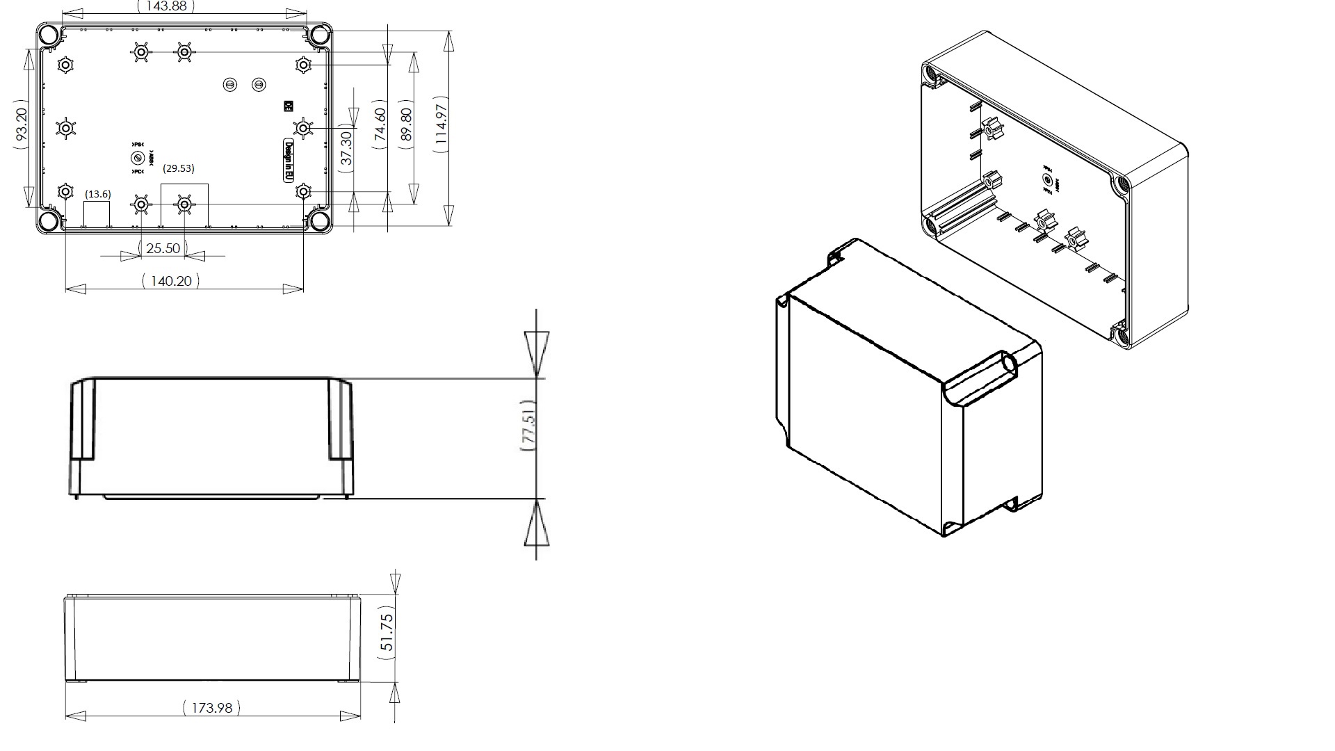 Grey ABS, IK08, IP66 junction box. Features captive plastic screws, slots for vertical PCB mounting and supplied with a 35mm Din rail with fixing screws. RAL7035