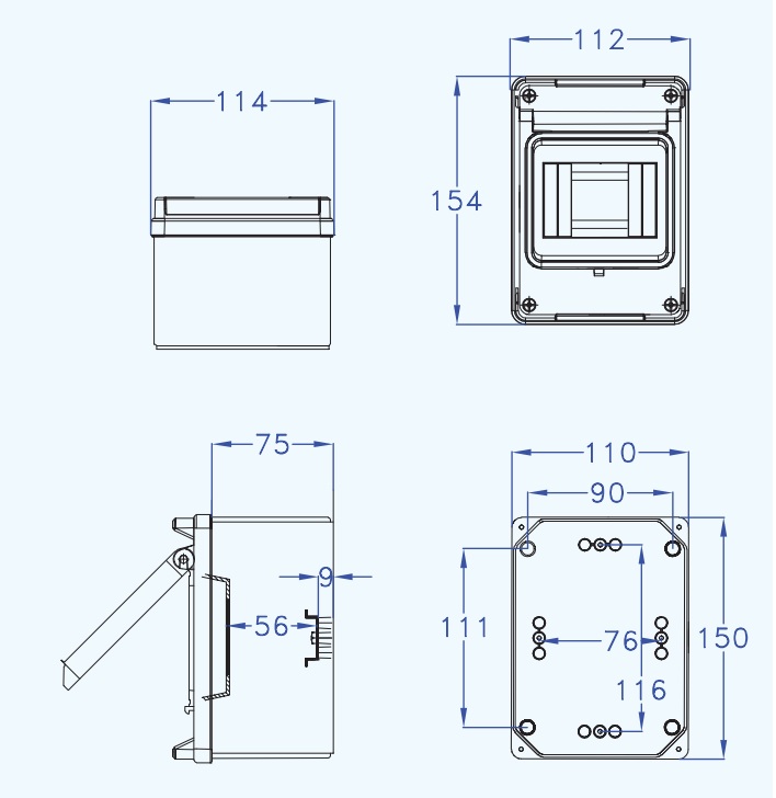 Grey ABS IP65 consumer unit enclosure with one hinged inspection window. 4-5 modules.