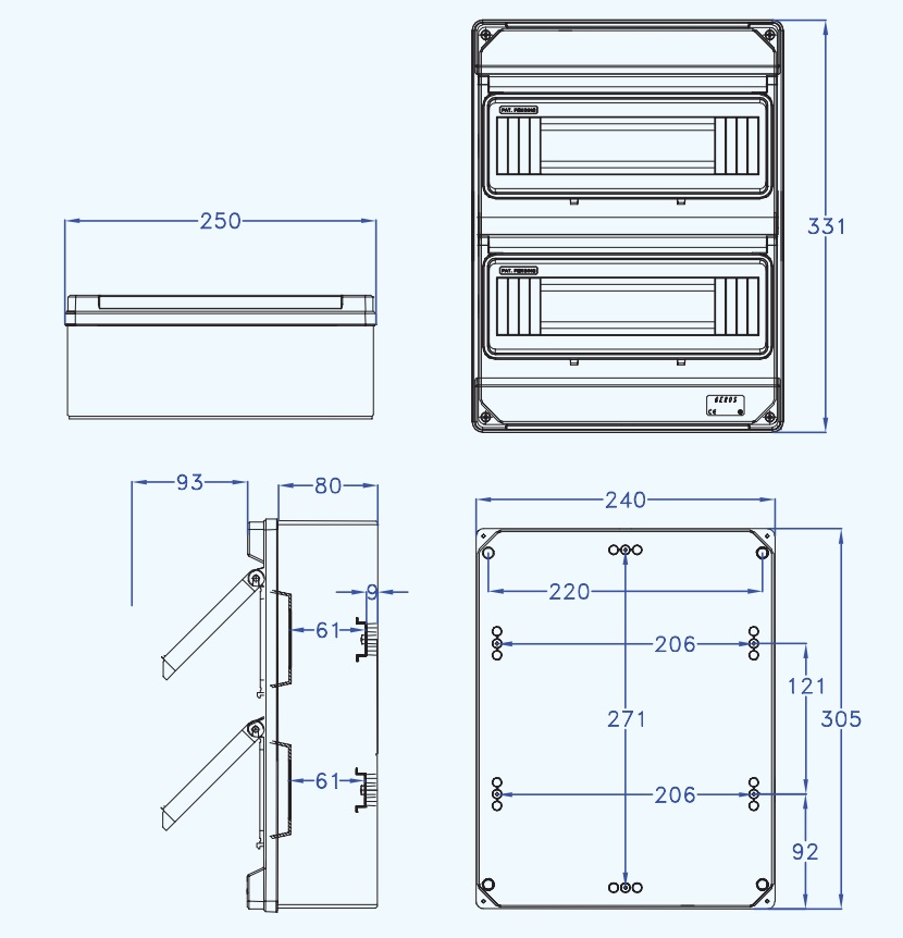 Grey ABS IP65 consumer unit enclosure with two hinged inspection windows. 12-24 modules.