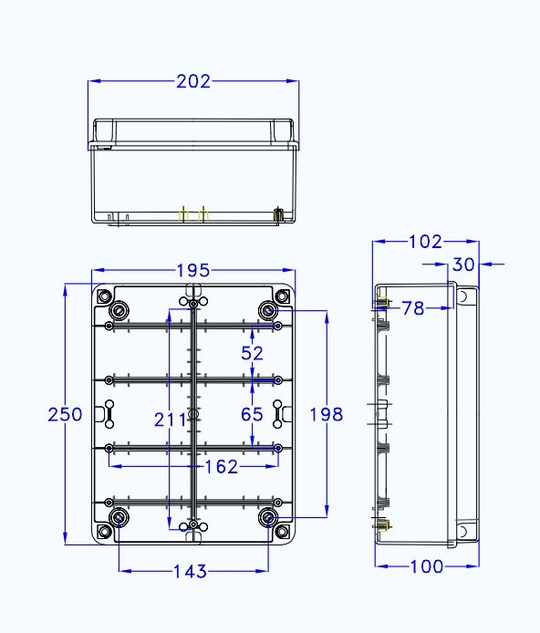 Internally there are mounting points for securing PCB and mounting plates as well as channels for mounting din rails.