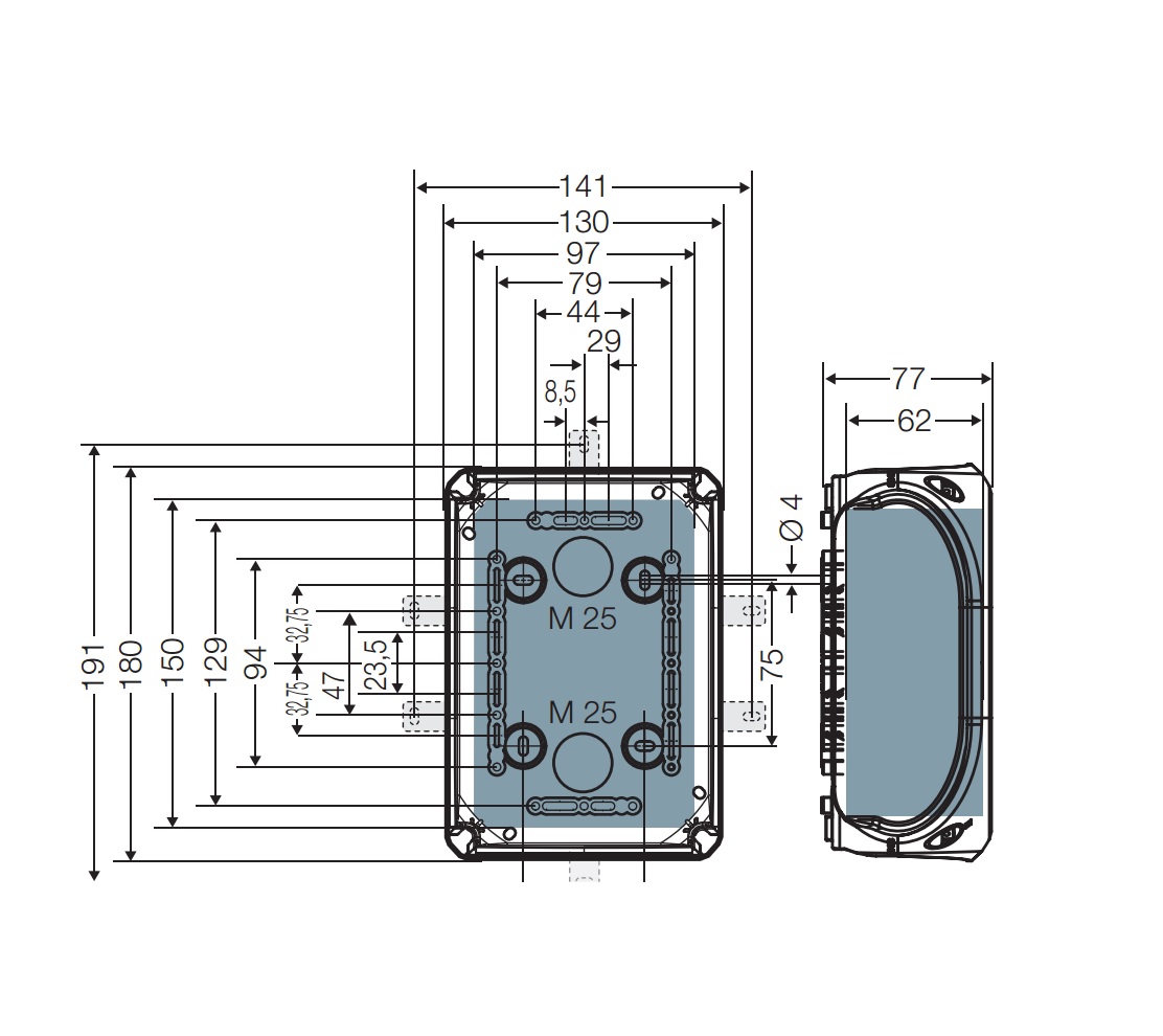The KF1000G junction box is a IP66, IP67 and IP69 rated weatherproof enclosure suitable for outdoor installations. It is resistant to UV radiation and is protected against rain and saltwater, as well as being temperature and impact resistant. This junction box is ideally suited to offshore applications.