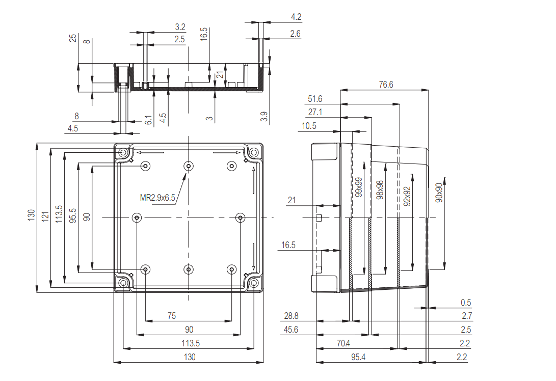 Rectangular, grey, RAL 7035, base 25mm, screw together, IP66/IP67 rated, internal PCB stand off’s, smooth finish, material Polycarbonate, clear top, transparent cover.