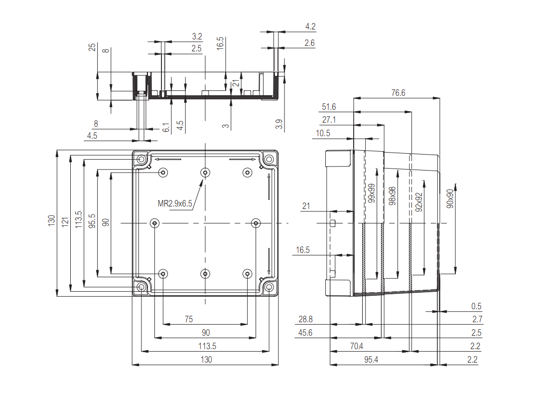 Rectangular, grey, RAL 7035, base 25mm, screw together, IP66/IP67 rated, internal PCB stand off’s, smooth finish, material Polycarbonate.