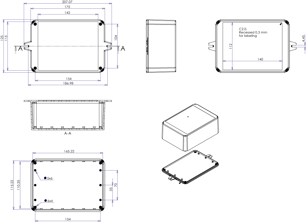 This flanged enclosure benefits from PCB mounts in both the lid and base as well as slots in the base of the enclosure to secure further PCB.
