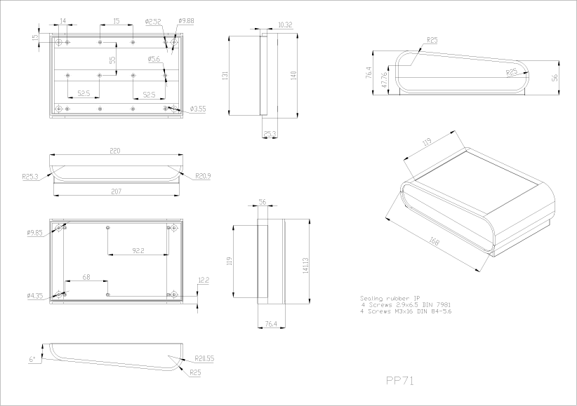 Large sloping IP65 rated desk top, grey, ABS. Screw together. Recessed top 169 x 119 x 1mm. Flat base with 2 x 201 x 33 x 3mm recesses. Internal pcb mounts. Height at front is 56mm to rear 77mm. ‘Alternative flat top version – Order code PP70GLOW COST MACHINING.This product can be machined to your specifications at the point of manufacture.Contact us for details.