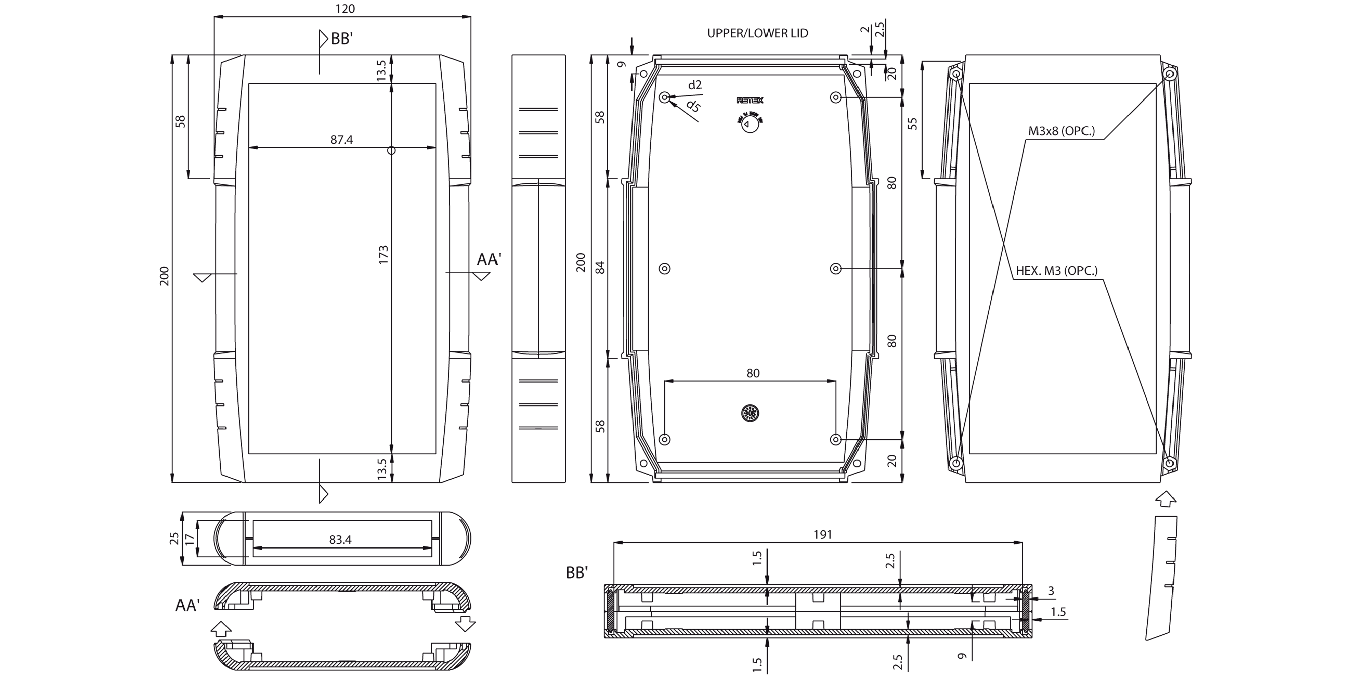 The case itself is moulded in high impact ABS material and is resistant to temperatures up to 85ºC. The enclosure can be sealed to IP65 using the optional sealing gasket. Each end of the enclosure has a removable panel to allow easy machining and addition of controls/LED’s and the lid and base both feature PCB mounts.