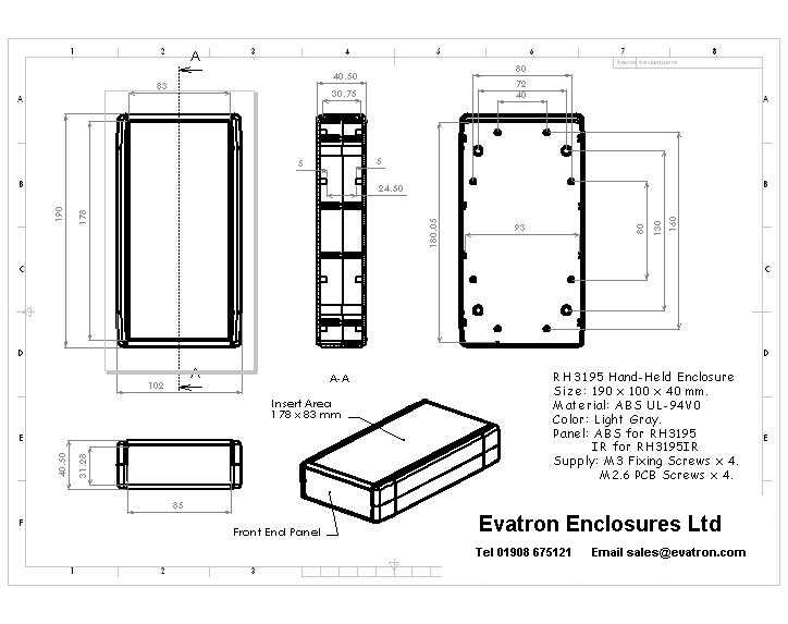 Large hand held ABS flame retardant, 94V-0 light Grey case with internal PCB mounts and PCB slots. Removable front panel in ABS plastic or Infra red. All fixings supplied.