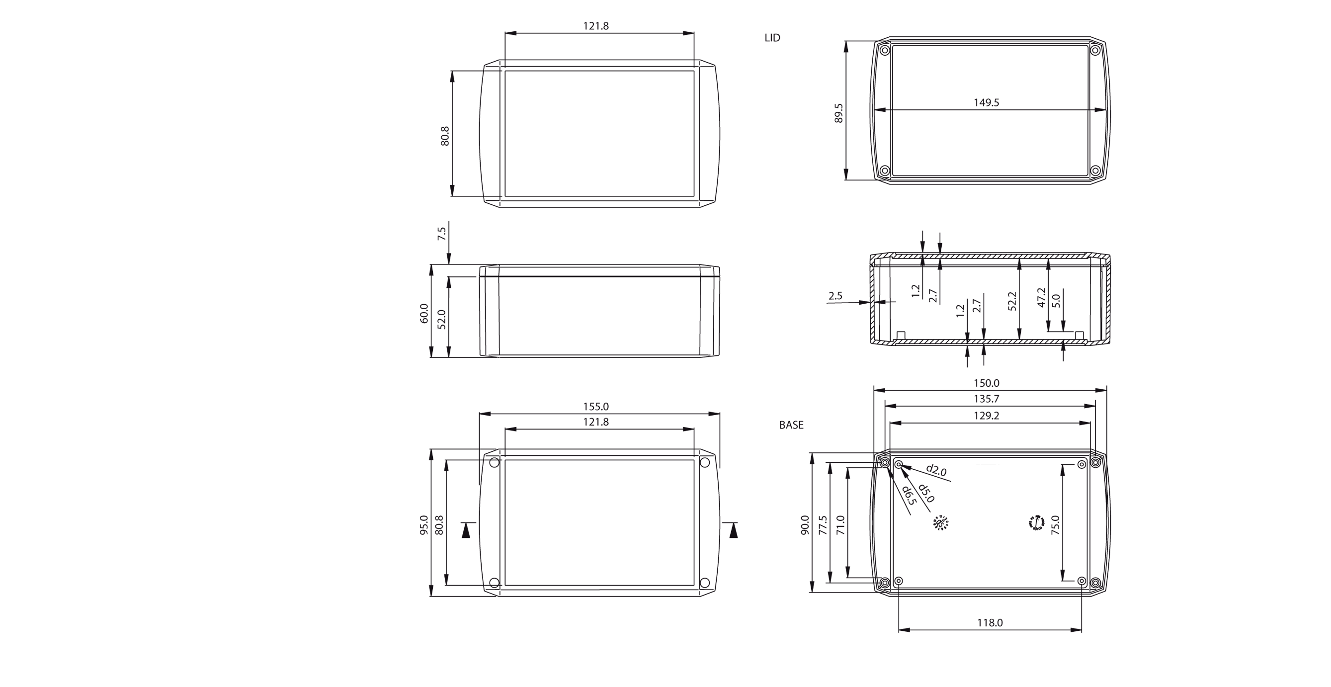 Standard ABS, light grey, with recessed lid and base for membrane keypads. Modern aesthetics with square edges and rounded lateral sides, lid mounted by four M3 bolts, hidden by self-adapting rubber plugs. Also available in black.