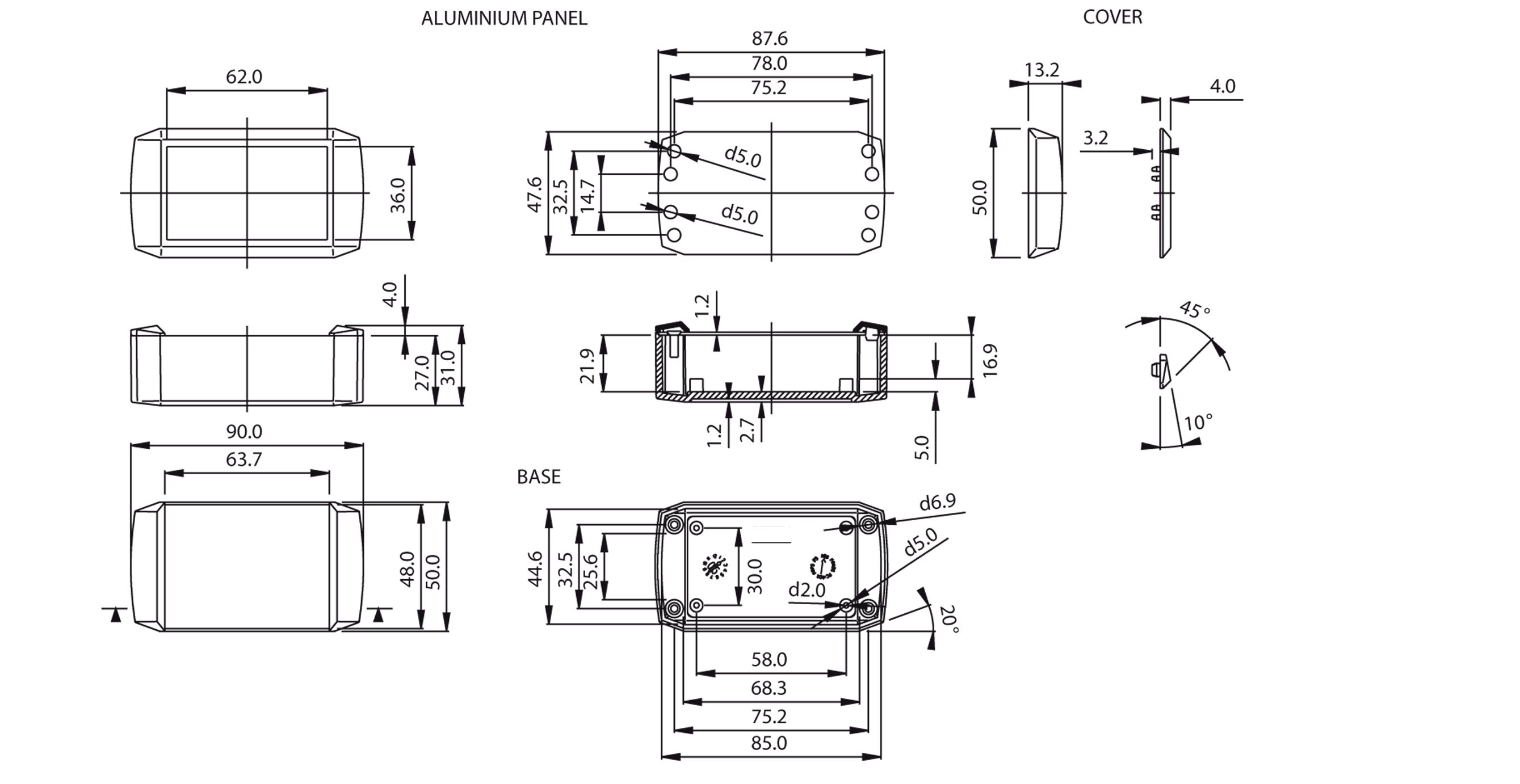 Standard ABS, light grey base and lid panel in 1mm aluminium silver anodised, with recessed base for menbrane keypads. Modern aesthetics with square edges and rounded lateral sides, lid mounted by four M3 bolts, hidden by plastic covers.