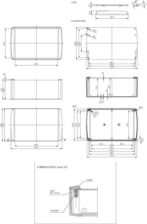 Standard ABS, light grey base and lid panel in 1mm aluminium silver anodised, with recessed base for membrane keypads. Modern aesthetics with square edges and rounded lateral sides, lid mounted by four M3 bolts, hidden by plastic covers.