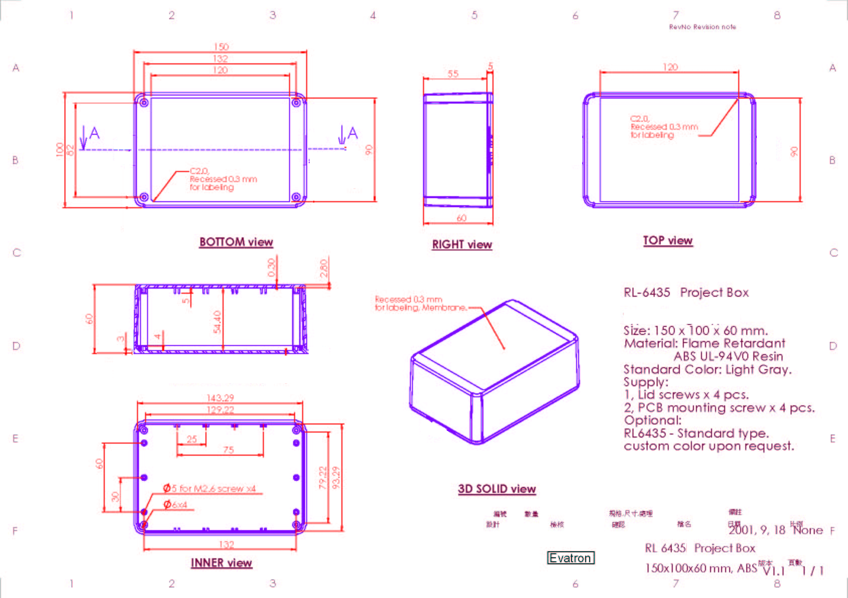 Multipurpose enclosure moulded in grey ABS HB material. Internal PCB mounts in both the top and the base. Top and bottom recessed areas. All fixings supplied. Also available with flanged lid.