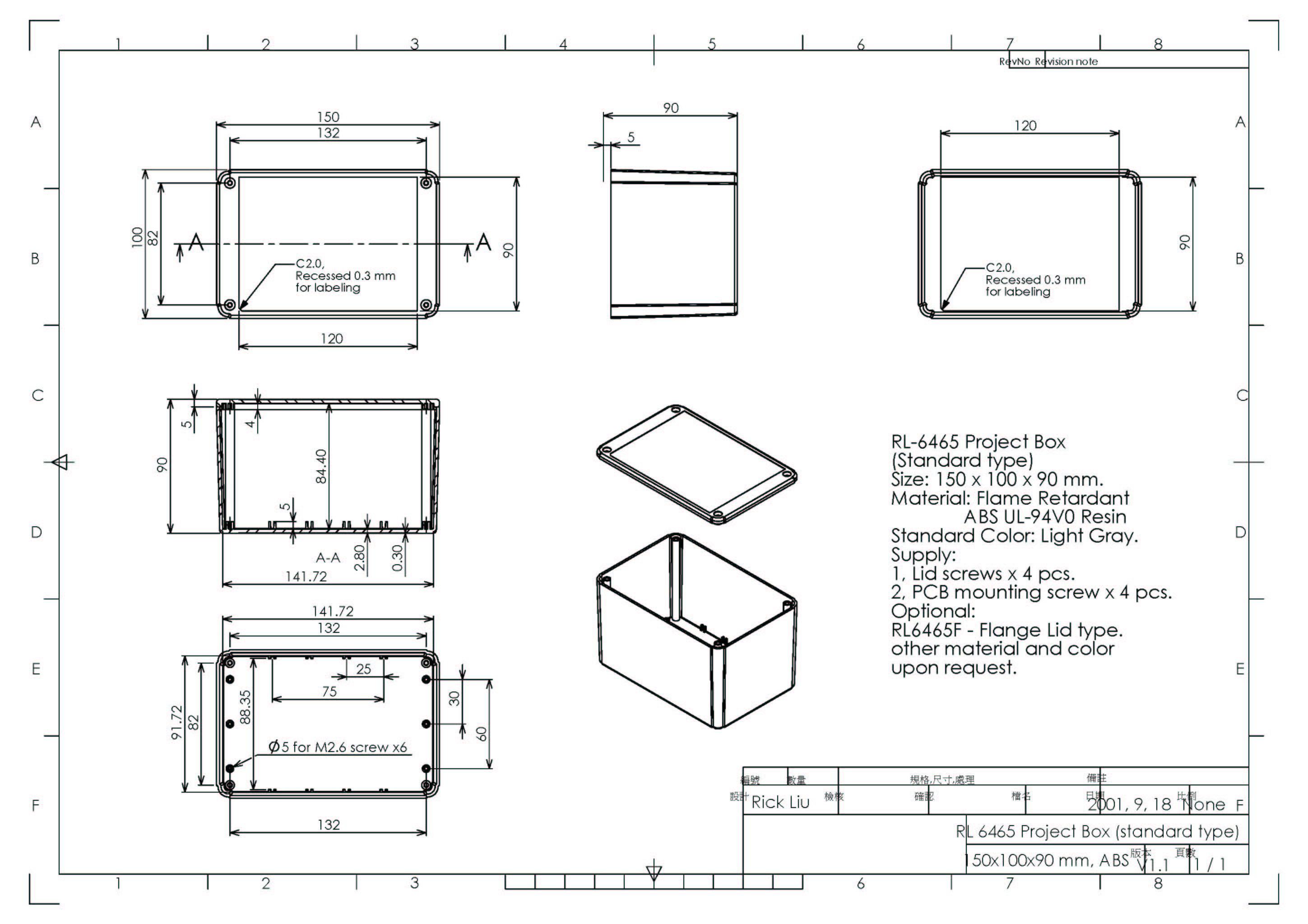 Multipurpose enclosure moulded in grey ABS HB material. Internal PCB mounts in both the top and the base. Top and bottom recessed areas. All fixings supplied. Also available with flanged lid.