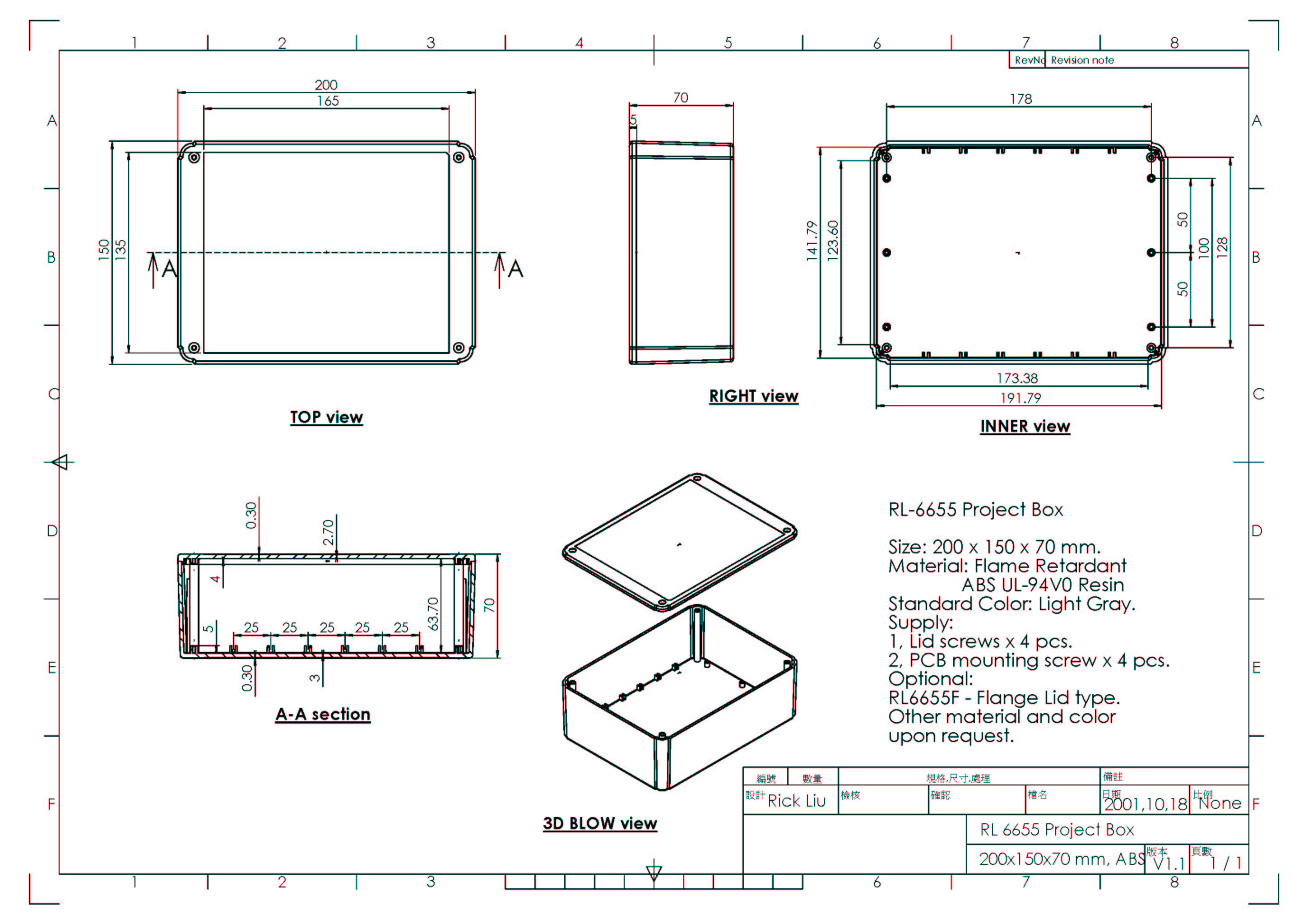 Multipurpose enclosure moulded in grey ABS HB material. Internal PCB mounts in both the top and the base. Top and bottom recessed areas. All fixings supplied. Also available with flanged lid.