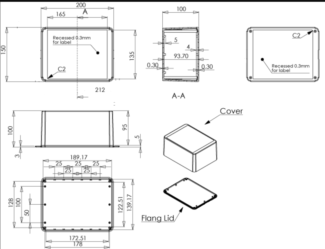 Multipurpose enclosure moulded in grey ABS HB material. Internal PCB mounts in both the top and the base. Top and bottom recessed areas. All fixings supplied. Also available with flanged lid.
