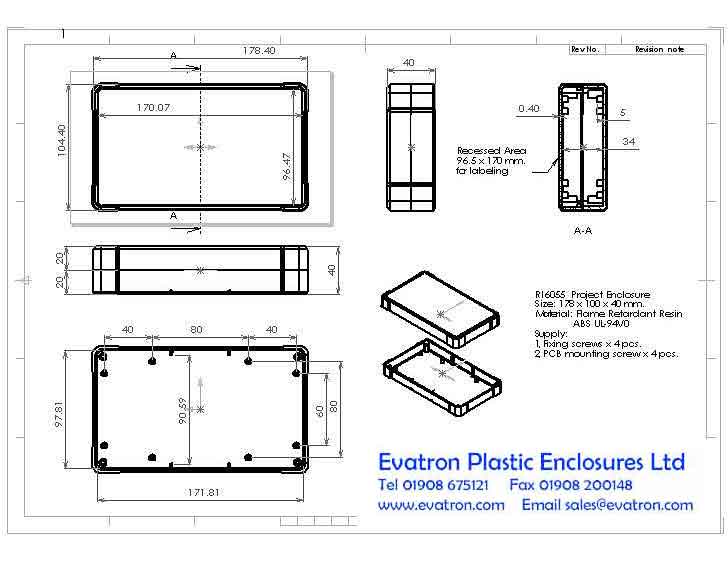 Large rectangular ABS flame retardant, 94V-0 light Grey case with internal PCB mounts. Top recessed area is 170 x 96.5 x 0.5mm. All fixings supplied.