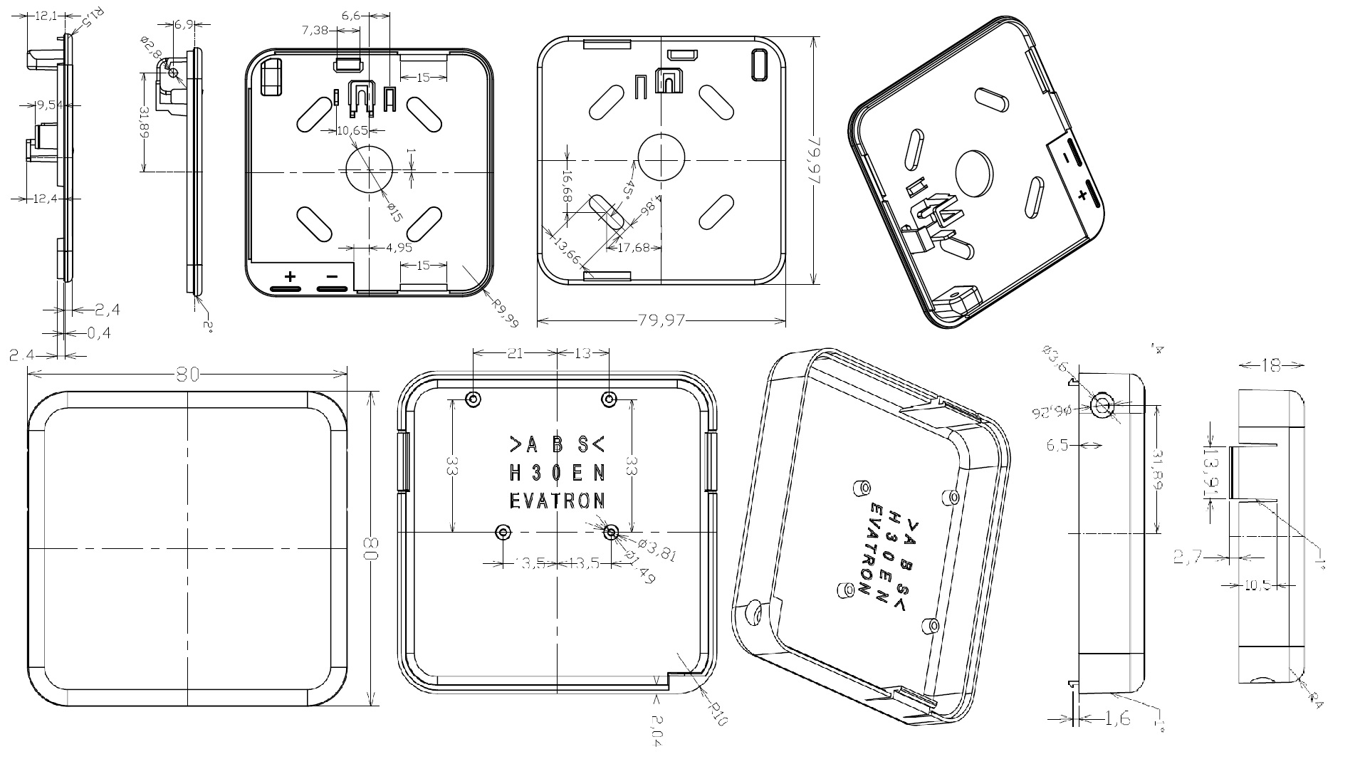 White sensor enclosure with no vents, PCB mounting points and pre drilled wall mounting points, screw fixing to one side. ABS UL HB.